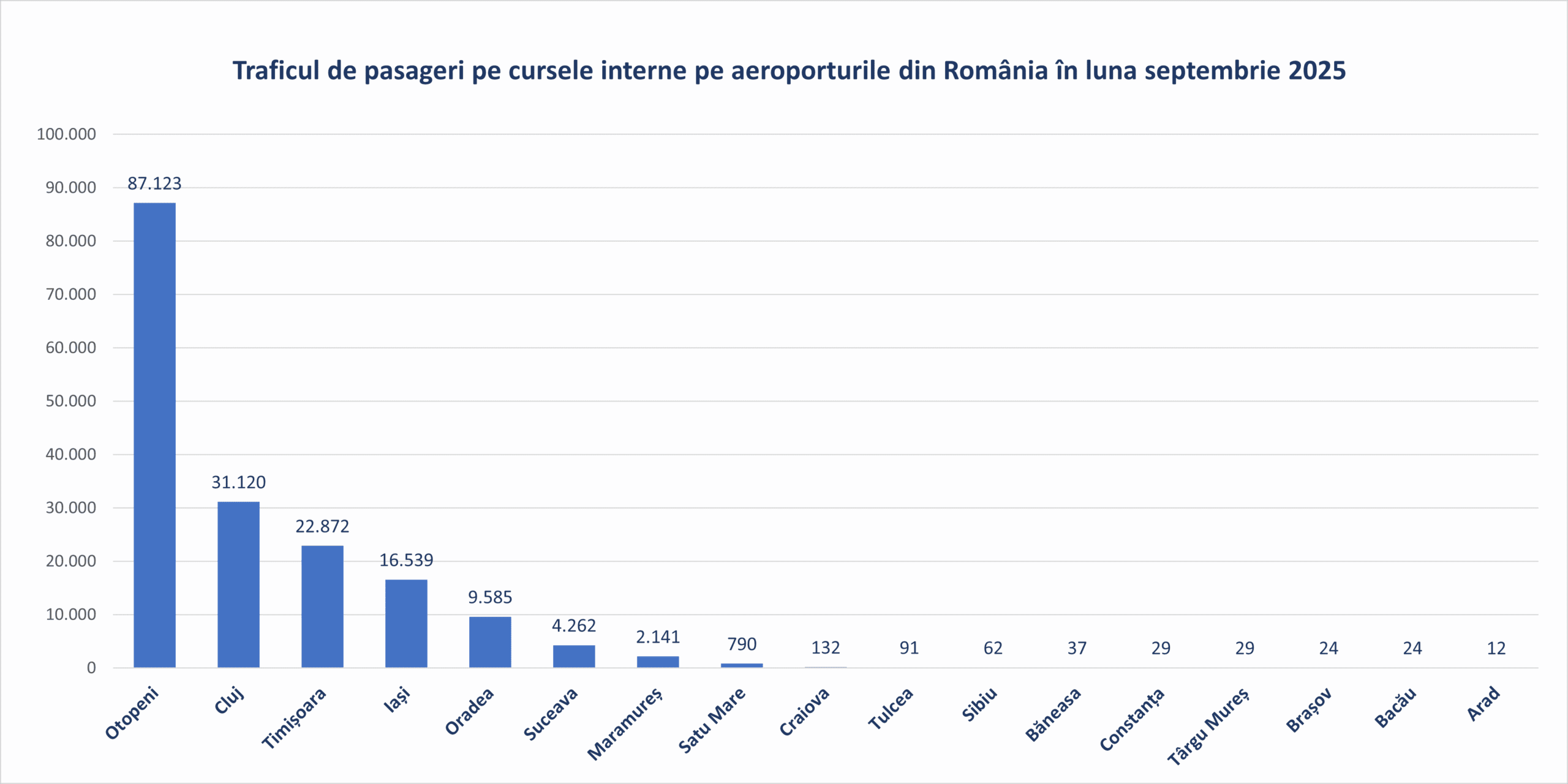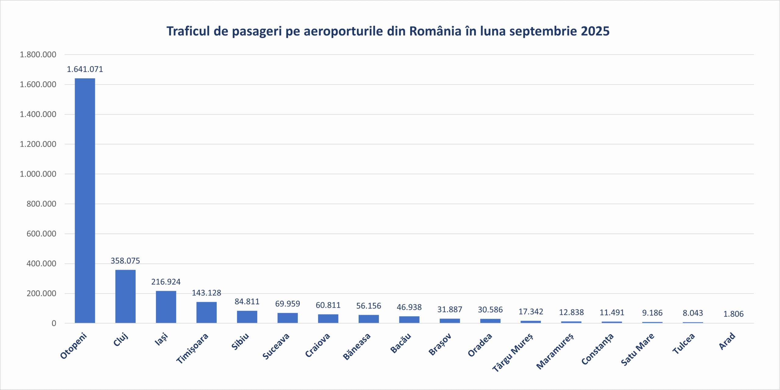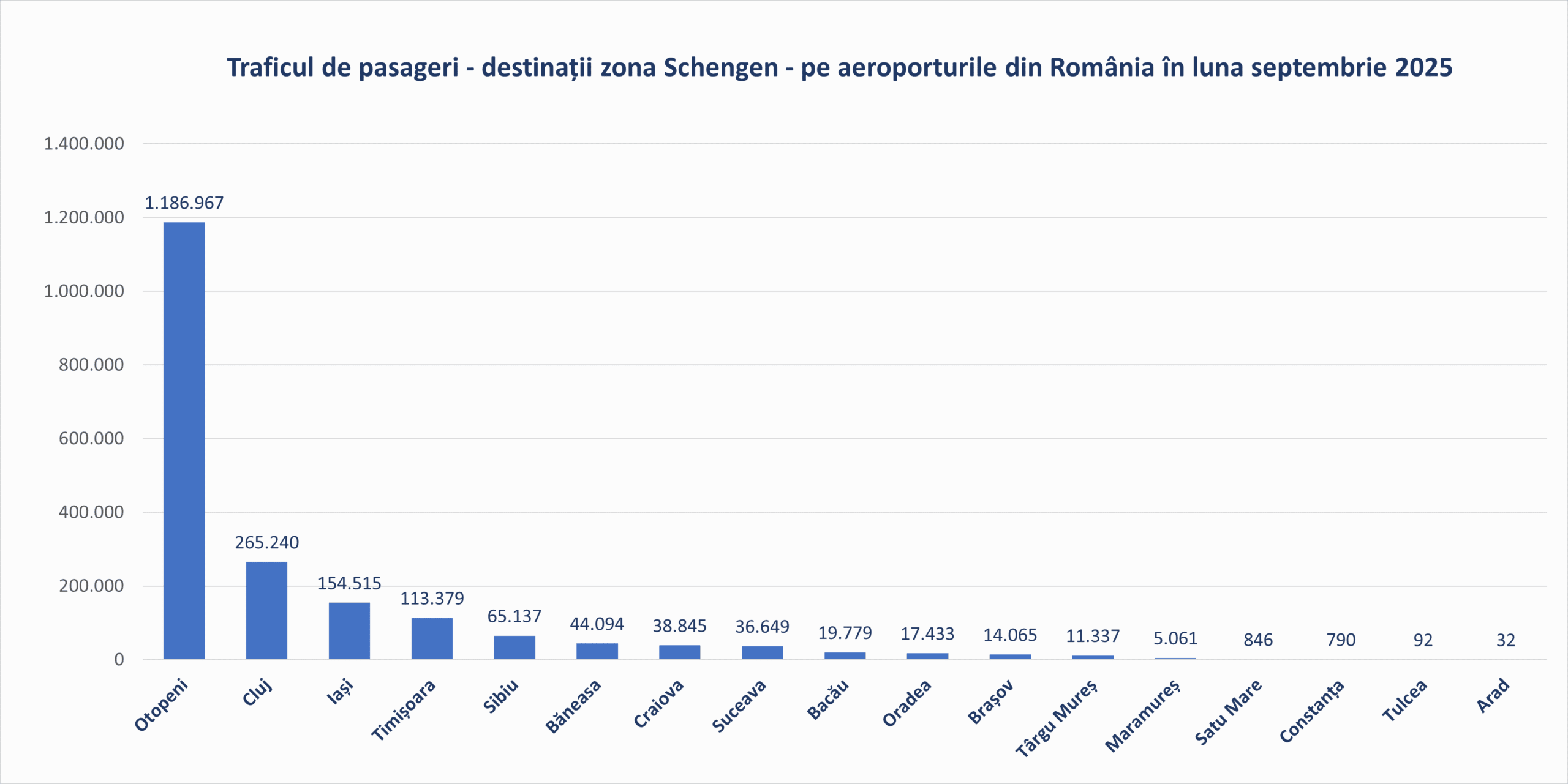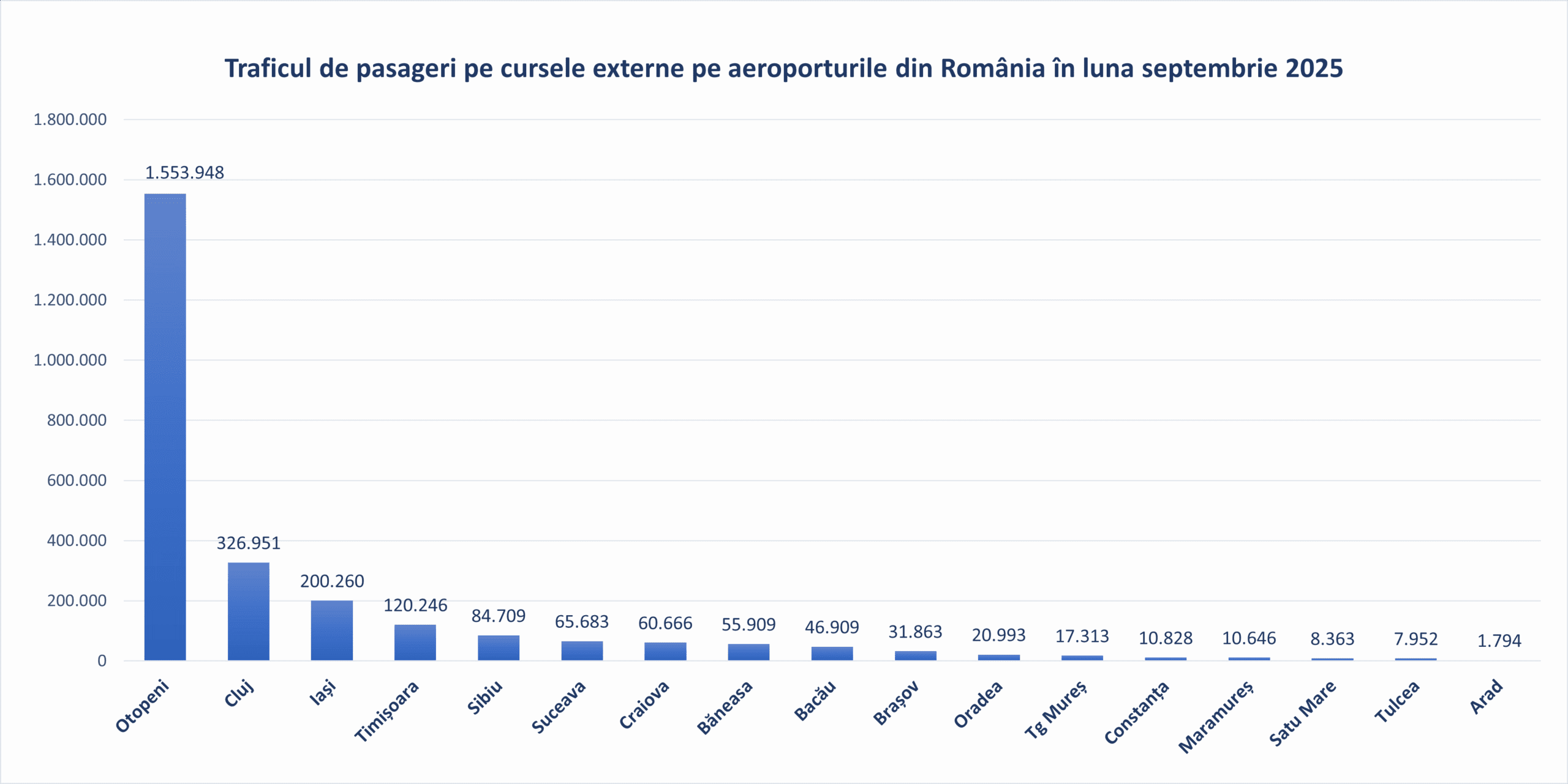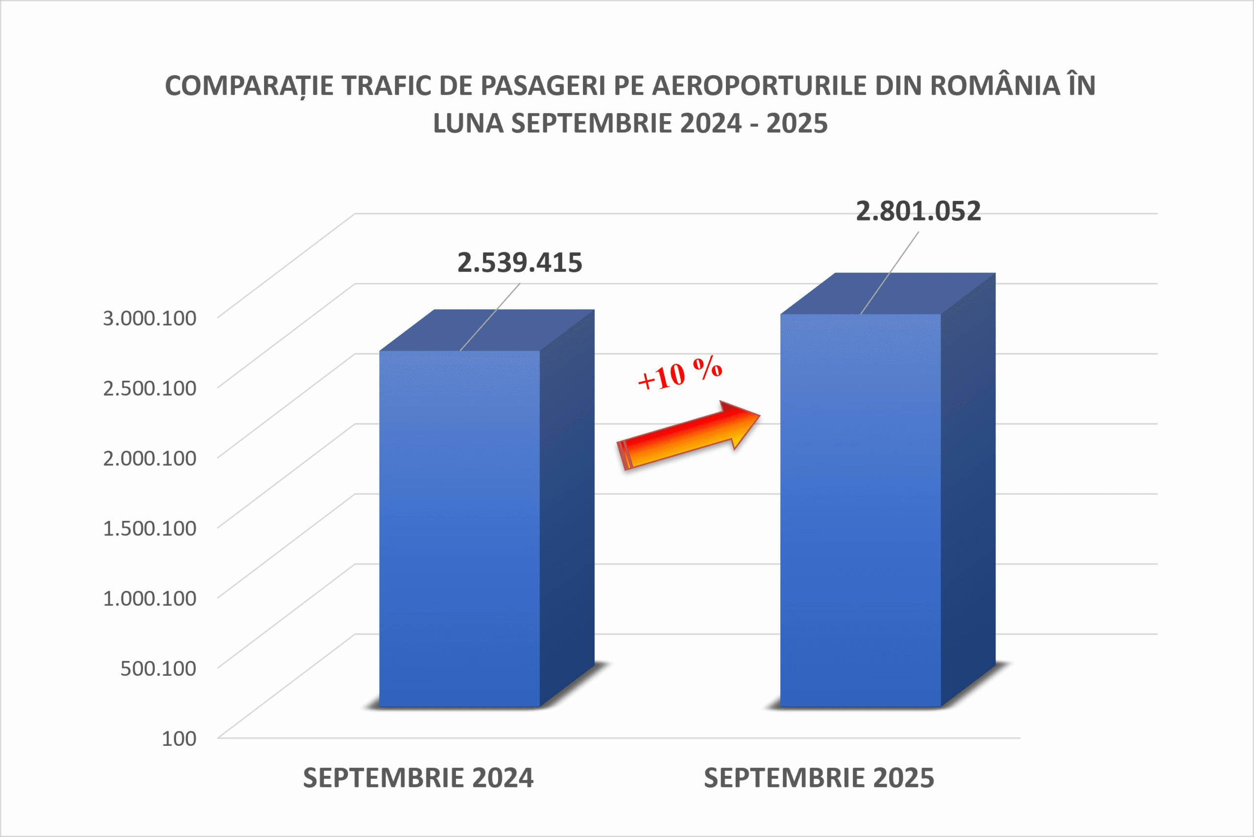 În luna septembrie 2025 aeroporturile din România au fost tranzitate de 2.801.052 pasageri, cu 10% mai mulți față de septembrie 2024 și cu 25% mai mulți comparativ cu aceeași lună din 2019, anul de referință anterior pandemiei.