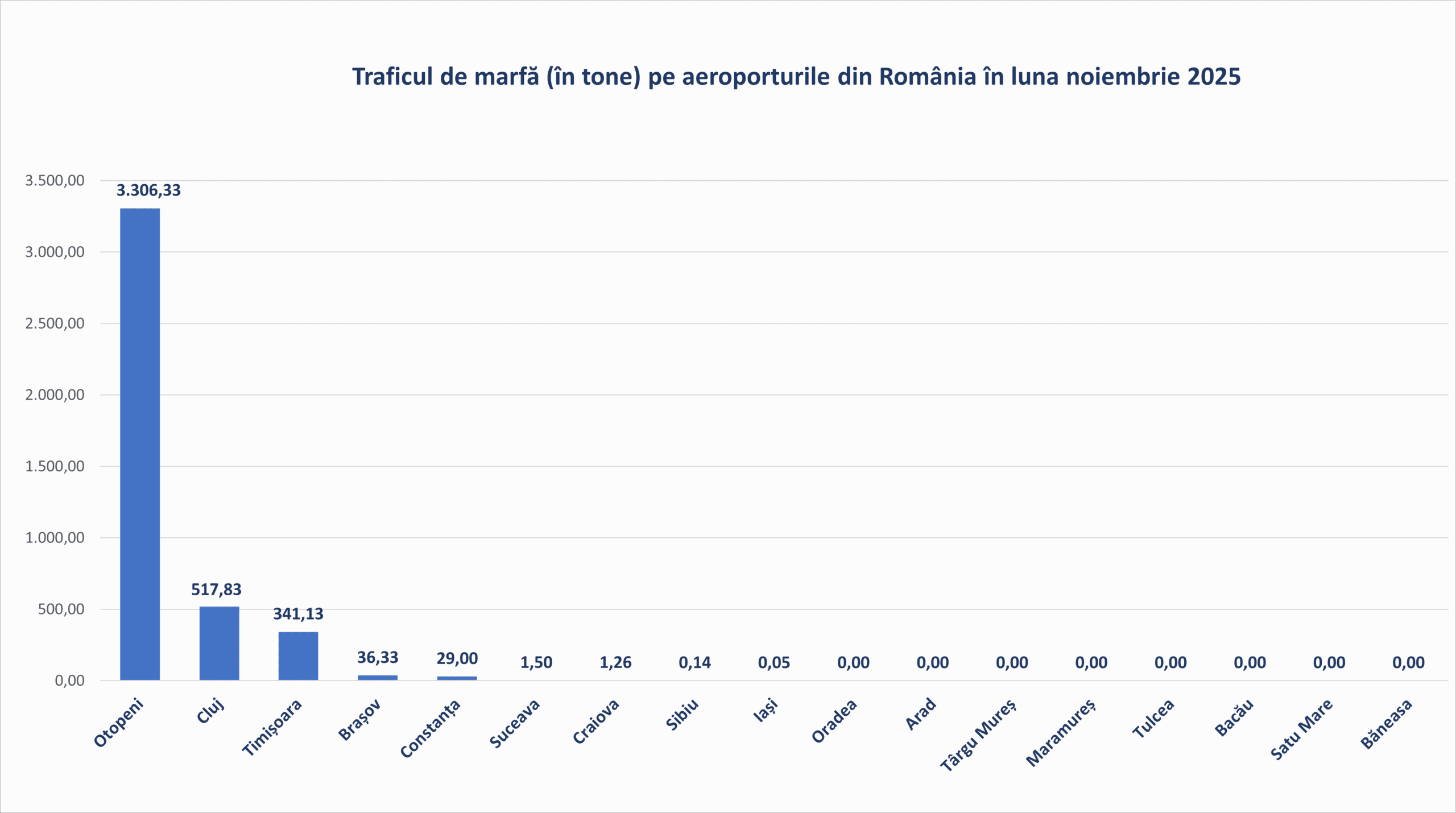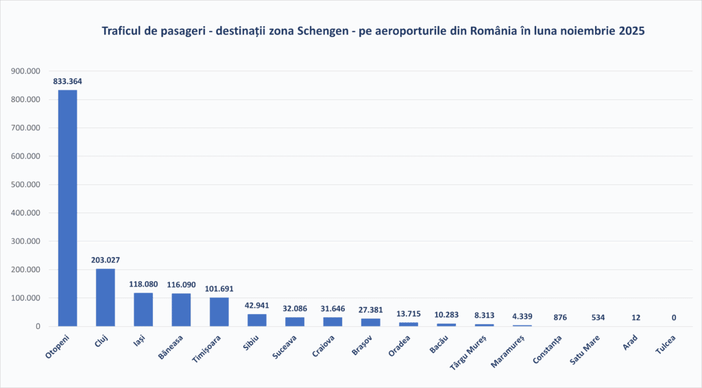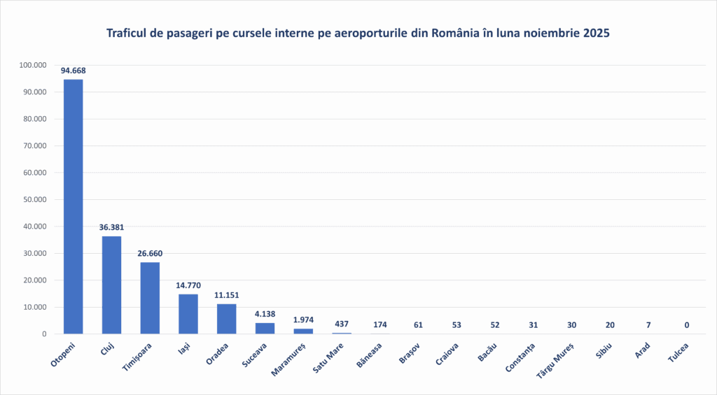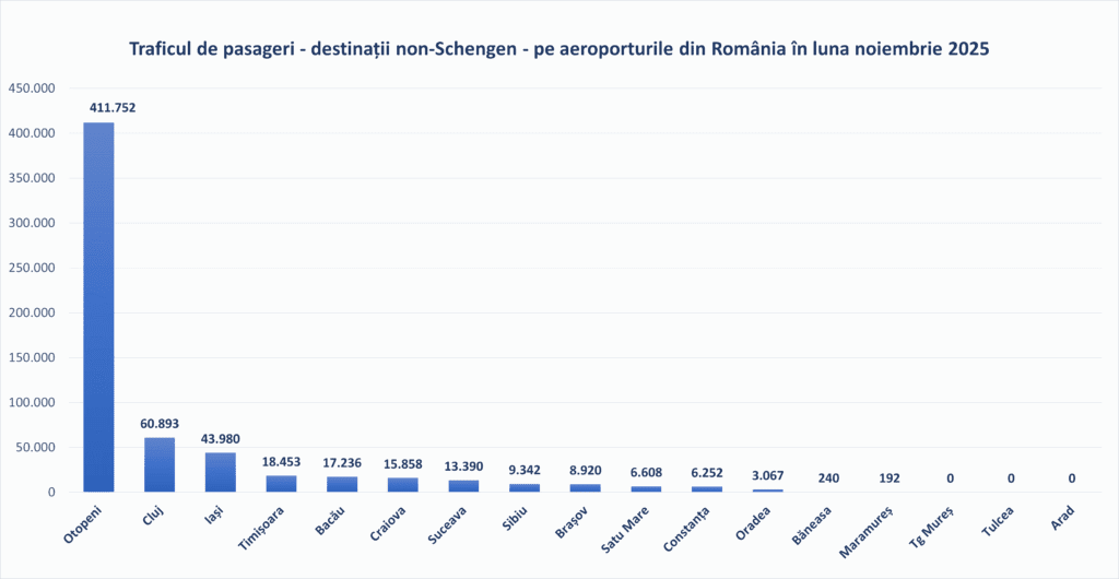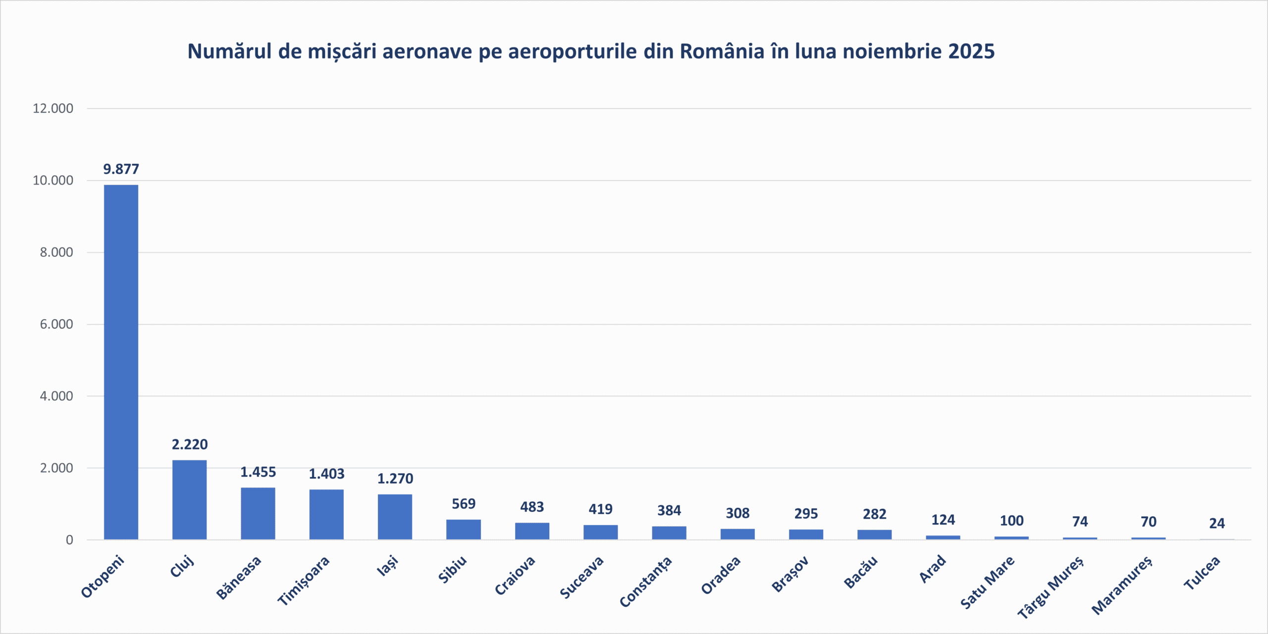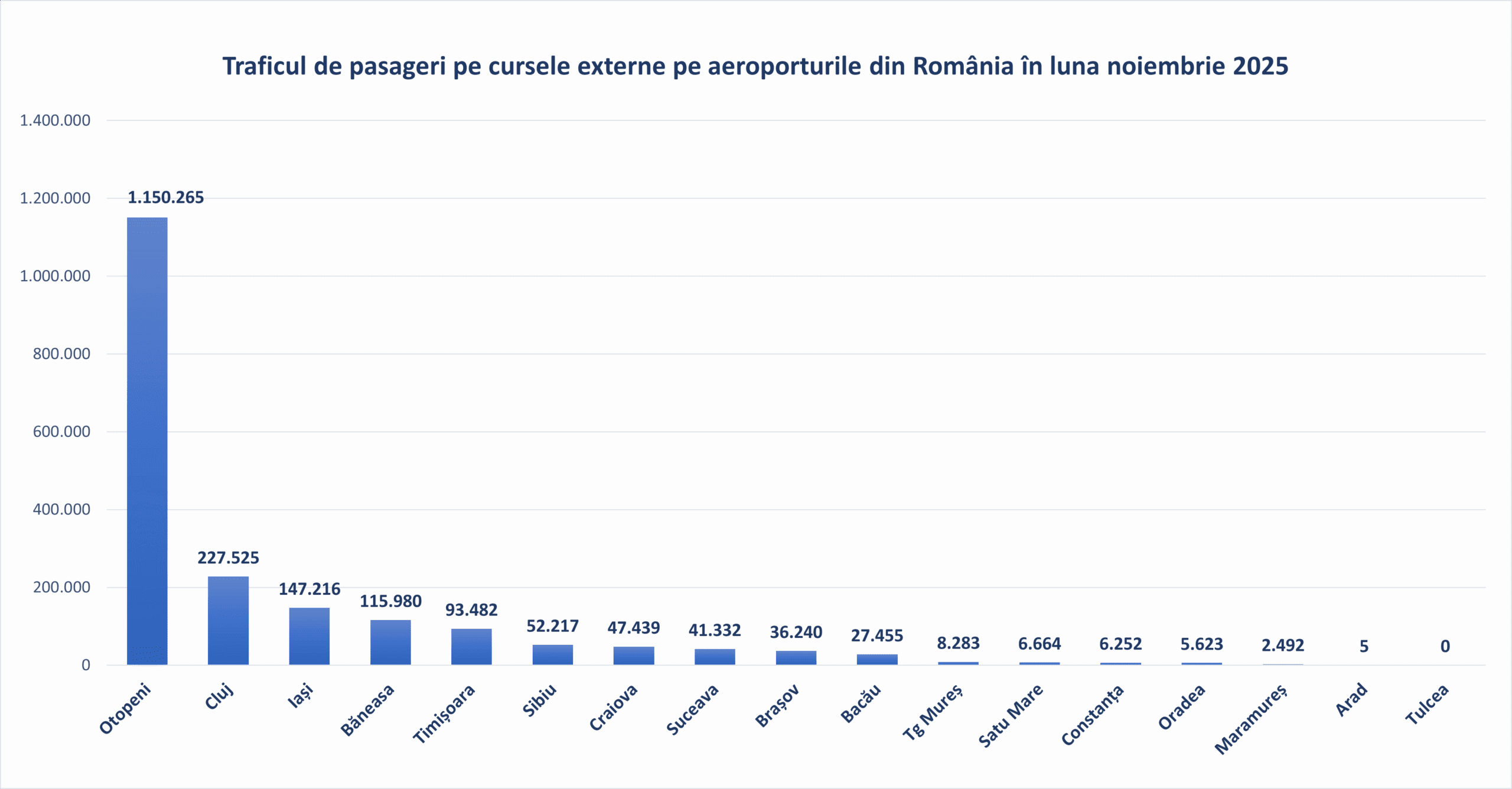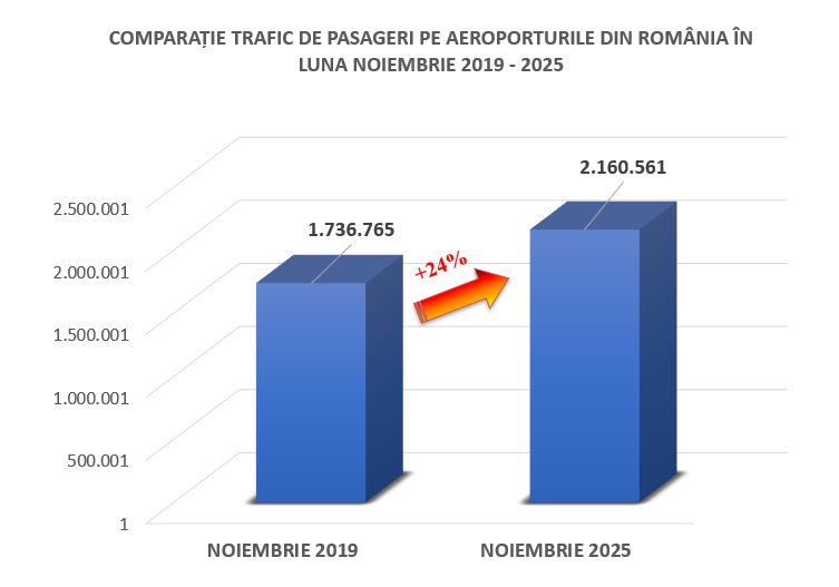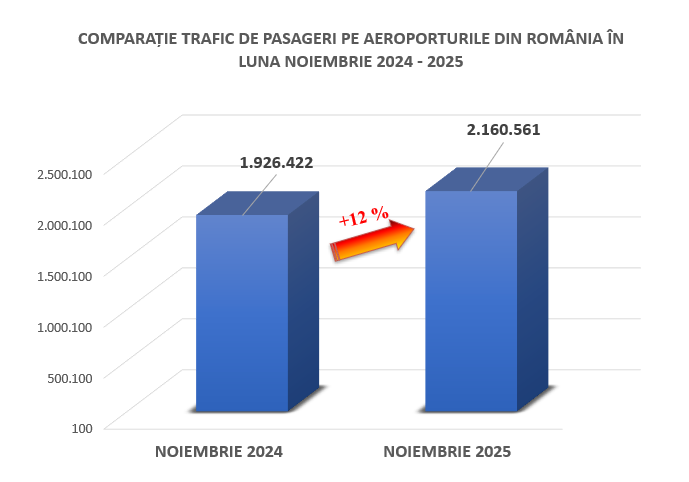 Traficul de pasageri pe aeroporturile din România a continuat tendința de creștere și în luna noiembrie 2025. Au fost înregistrați 2.160.561 pasageri, cu 12% mai mult față de noiembrie 2024 și cu 24% peste nivelul din noiembrie 2019, anul de referință pre-pandemie.