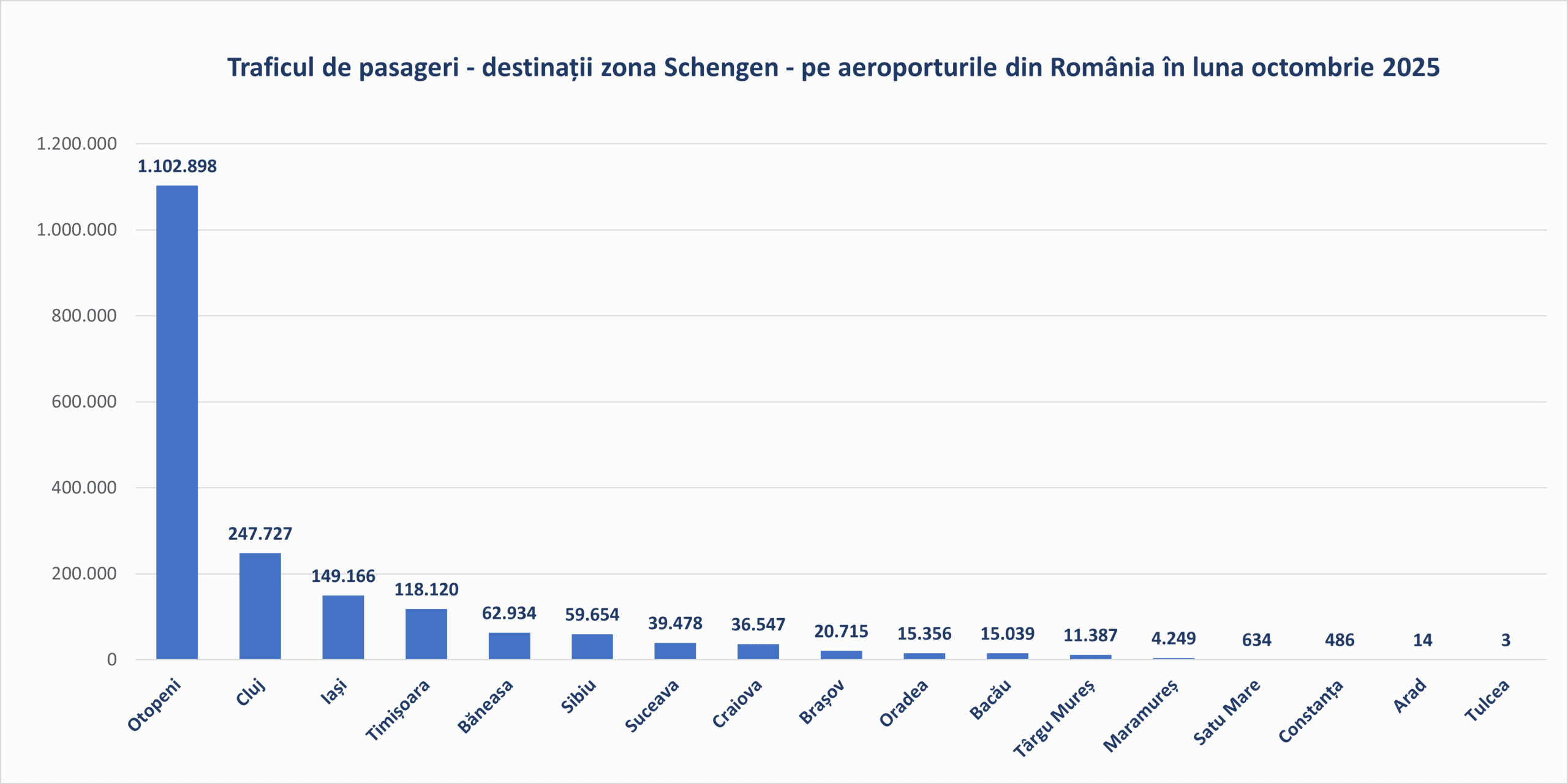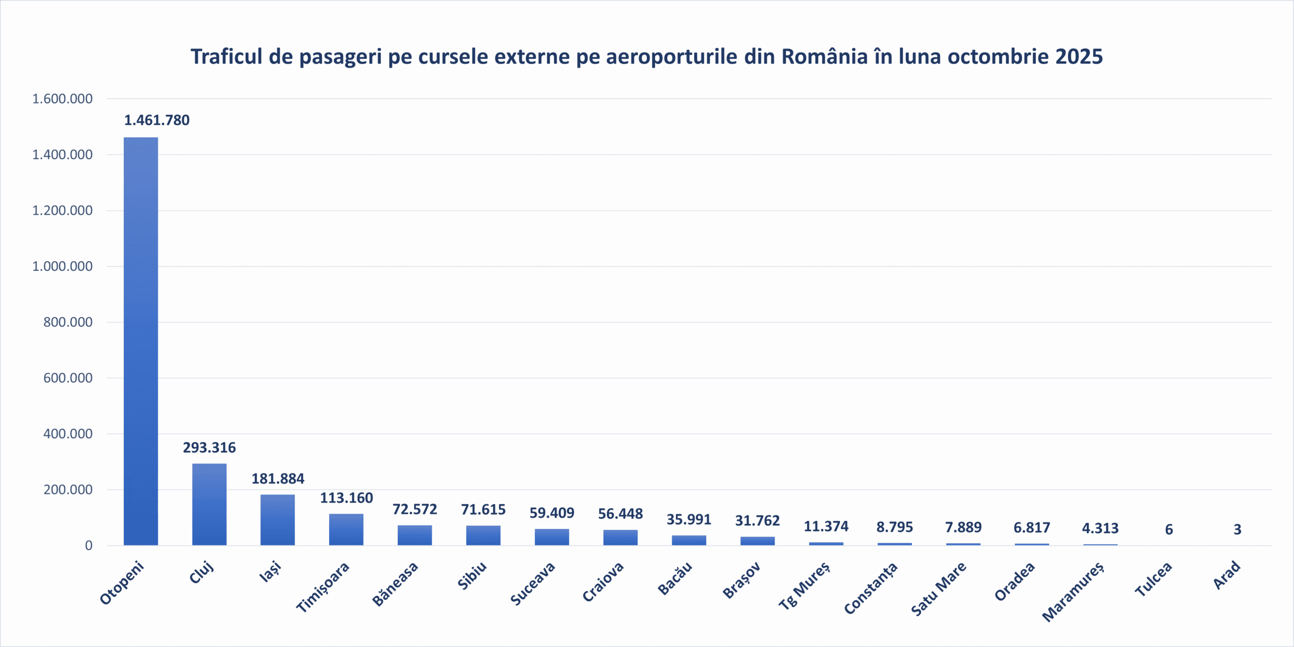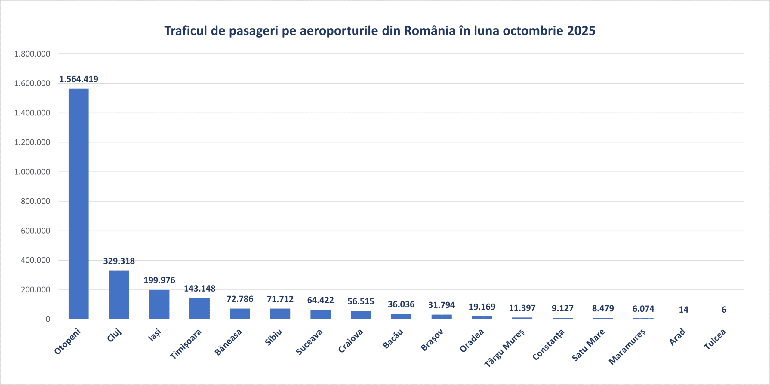 Traficul de pasageri pe aeroporturile din România a ajuns în octombrie 2025 la un total de 2.624.392 pasageri, marcând o creștere puternică atât față de perioada pre-pandemie, cât și față de anul precedent.