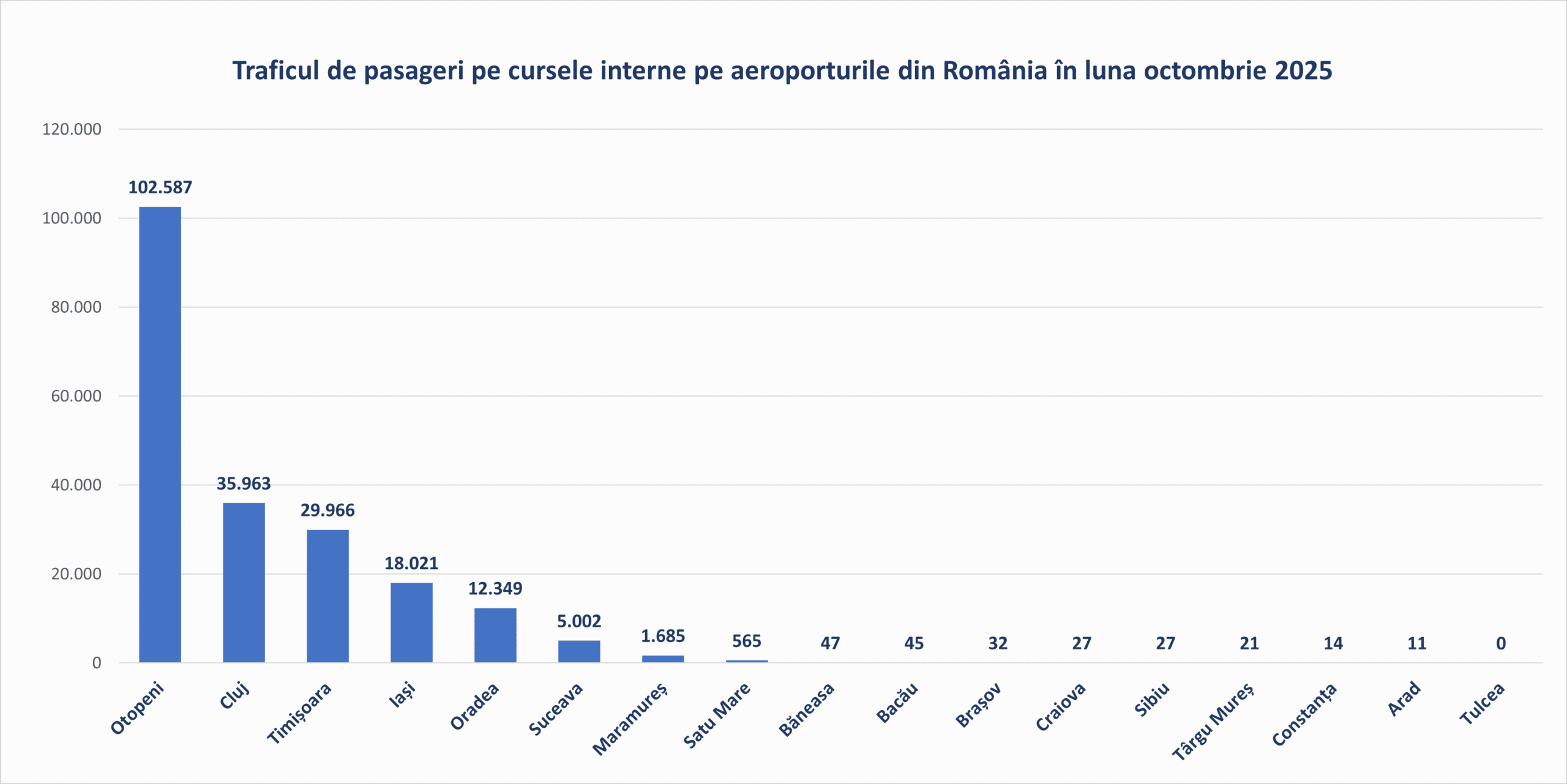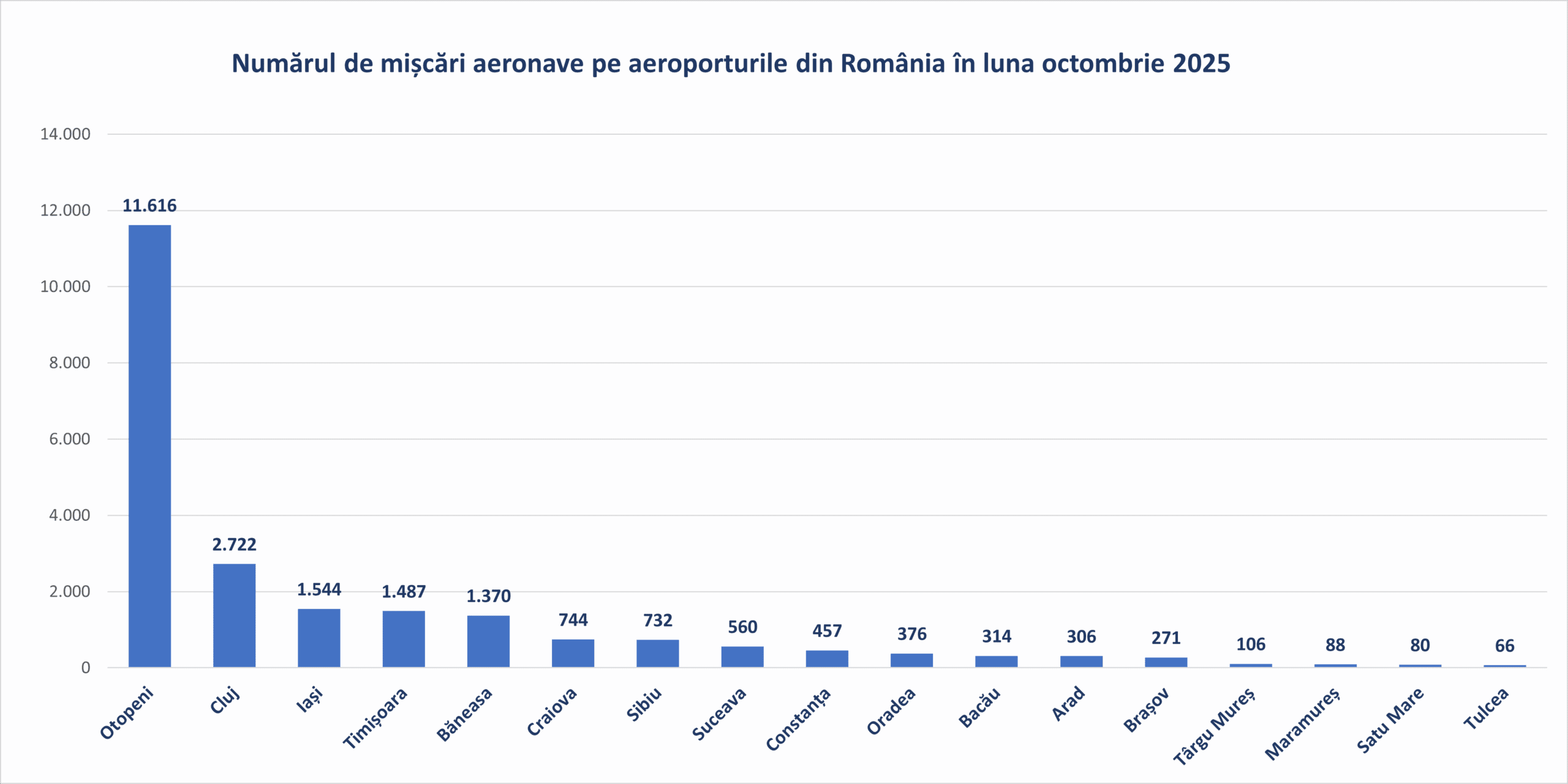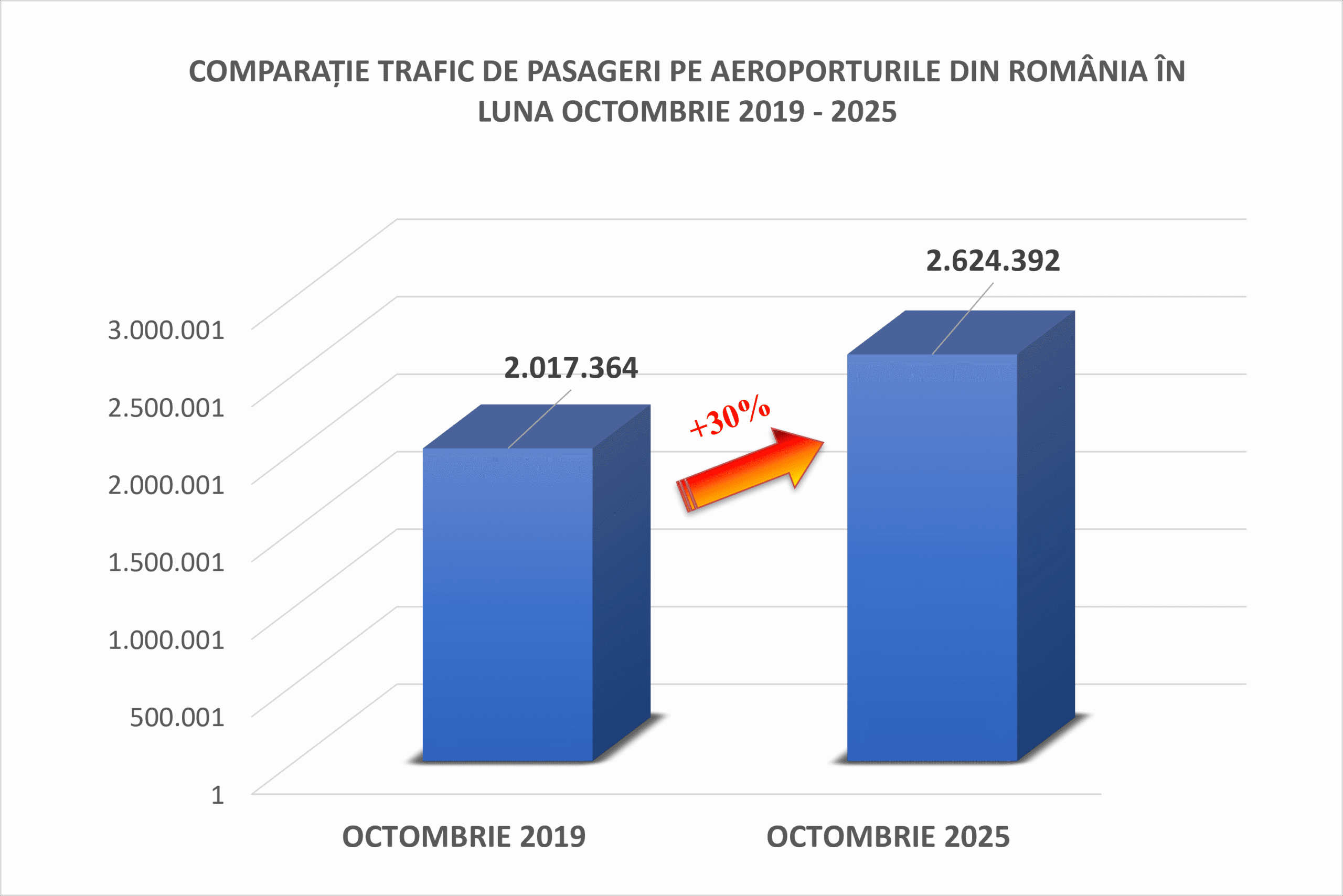 Comparativ cu octombrie 2019 traficul a crescut cu 30%, iar față de octombrie 2024 aeroporturile din România au înregistrat o creștere de 12%. Aceste rezultate indică o piață aviatică în plină dezvoltare și un interes tot mai mare pentru zboruri. Extinderea rutelor interne și internaționale, creșterea numărului de operatori dar și investițiile constante în infrastructura aeroportuară sunt doar câțiva dintre factorii care au contribuit la această evoluție pozitivă.