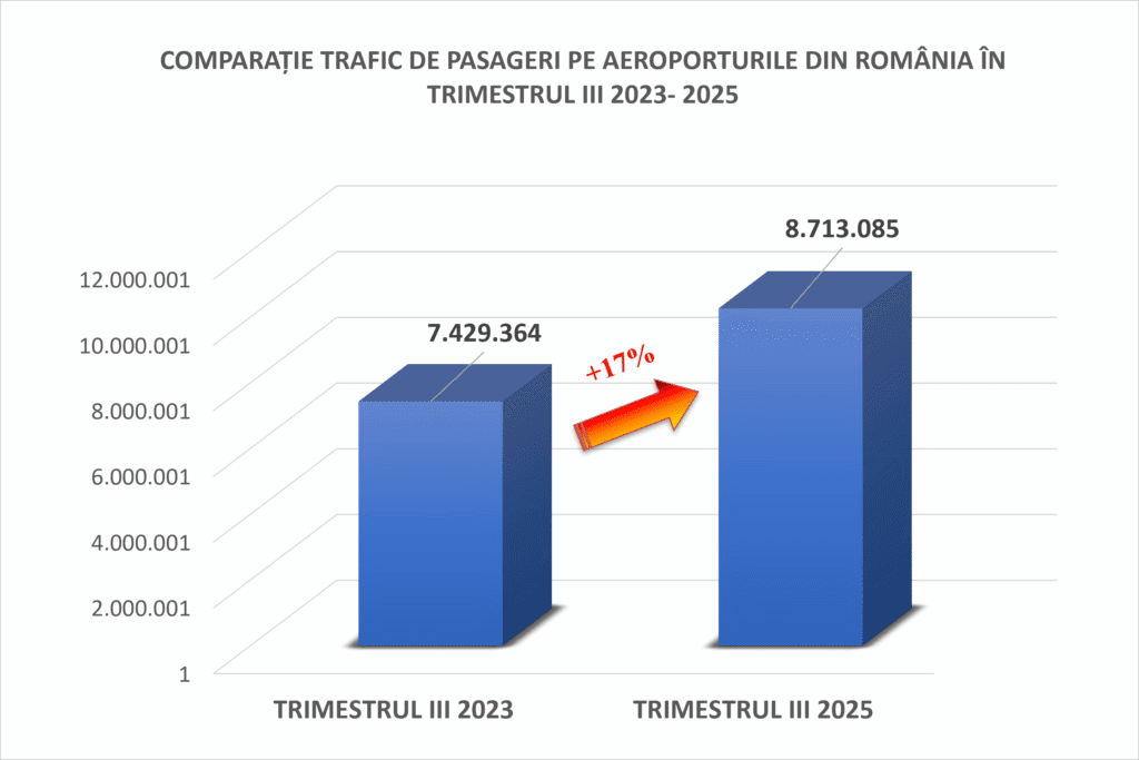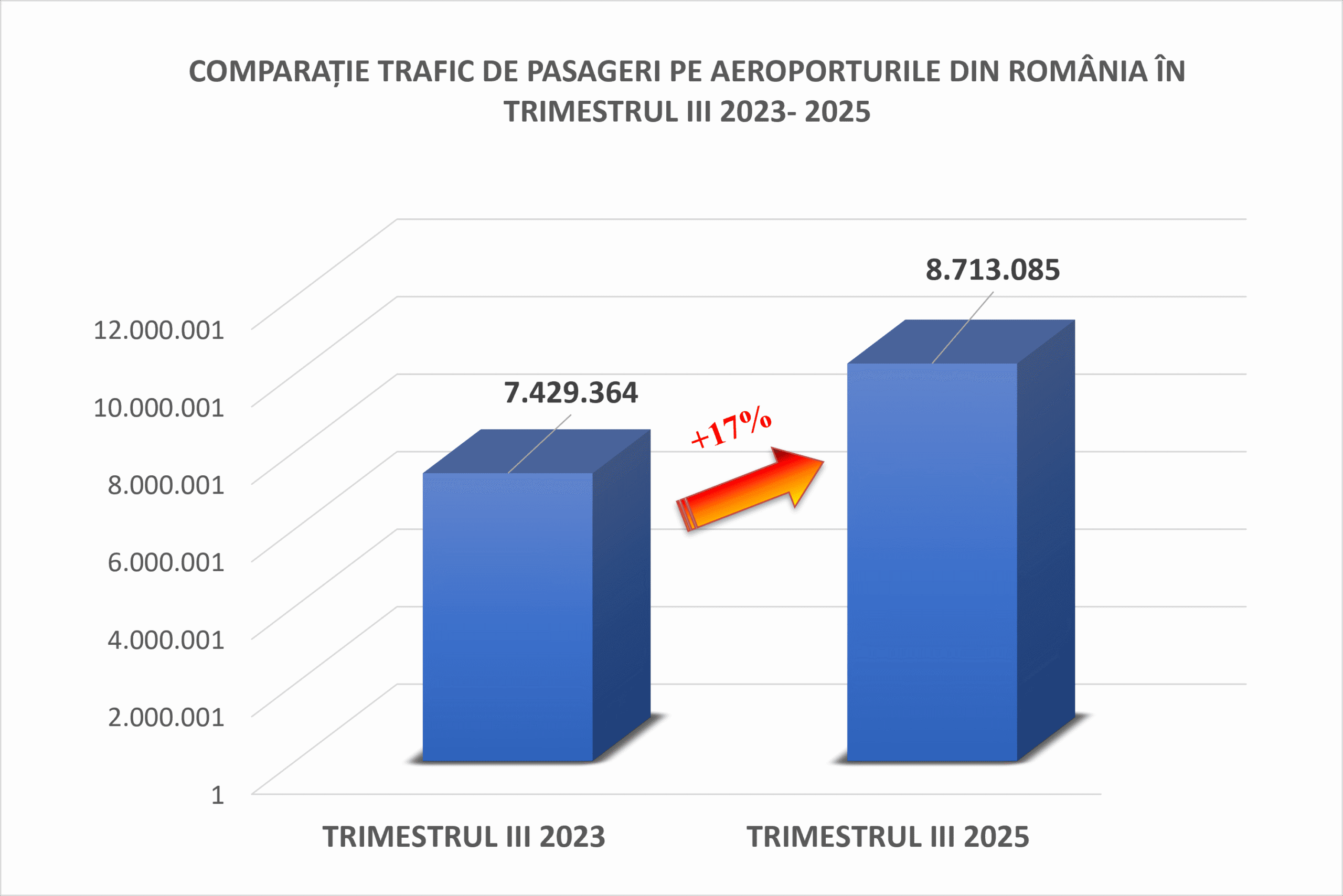 În trimestrul lll al anului 2025 aeroporturile din România au înregistrat peste 10,2 milioane de pasageri, marcând o creștere de 38% față de aceeași perioadă a anului 2023 și de 29% față de trimestrul lll 2024. Tendința ascendentă este rezultatul dezvoltării continue a rețelelor de rute și confirmă interesul tot mai mare al pasagerilor pentru zborurile din și spre România.